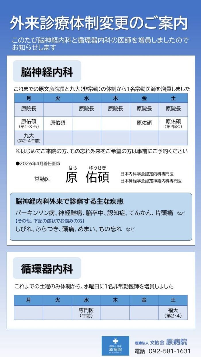 脳神経内科・循環器内科の外来診療日の追加について