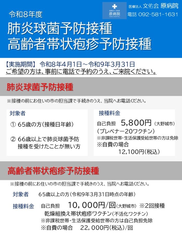 医)文佑会 原病院では、大野城市をはじめとする福岡県内の自治体が実施している令和8年度 肺炎球菌予防接種 及び 高齢者帯状疱疹予防接種 の実施指定医療機関として、令和8年4月1日から令和9年3月31日まで、予防接種を実施しています。