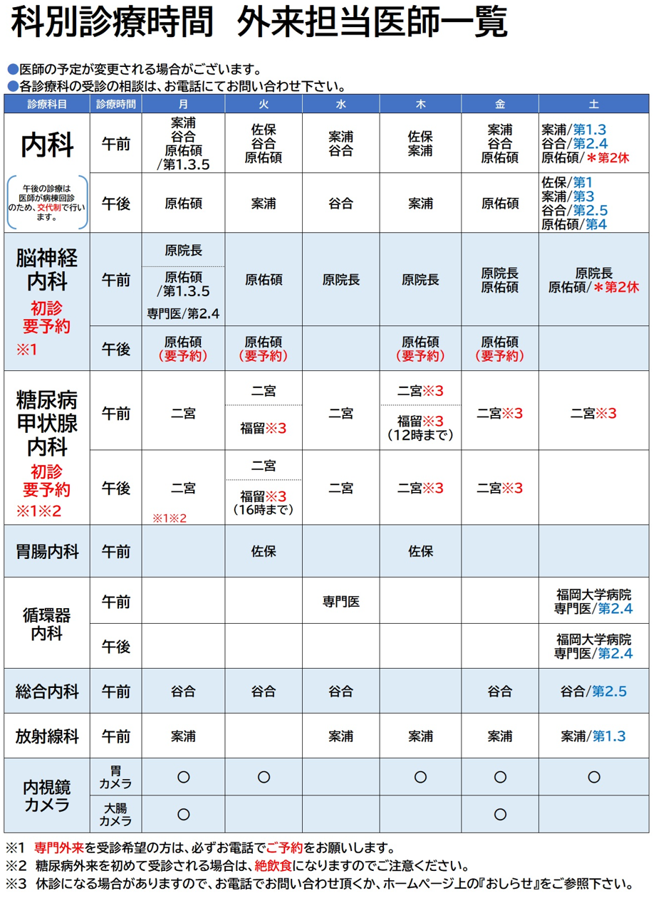 各診療科ごとの、診療日・診療時間は以下よりご確認ください。 学会・出張等により休診になる場合がございますので、お電話にて事前にお問合せください。